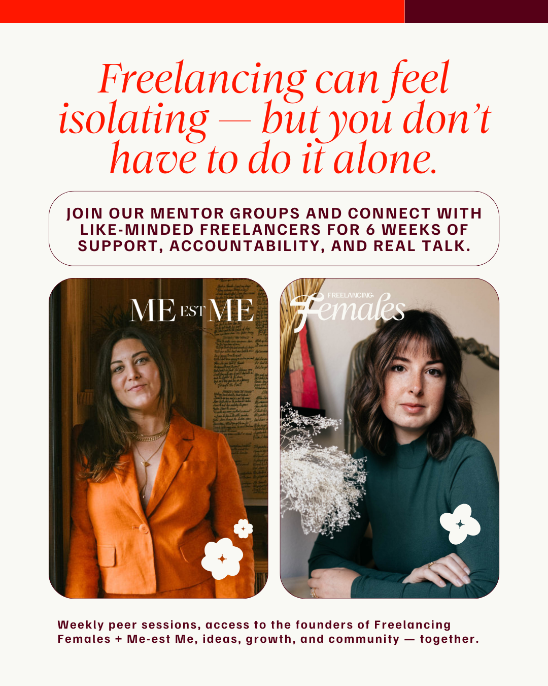 Whether you want to chat through an email you’ve been waiting to send, a collab idea you’re working through, or figure out your pricing, our Mentor Groups can help you find clarity with exactly what you’re working through. Freelancers and entrepreneurs can understand the specific challenges and opportunities you face. These groups can offer advice and support based on their own experiences and provide unique insights.